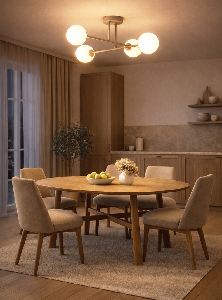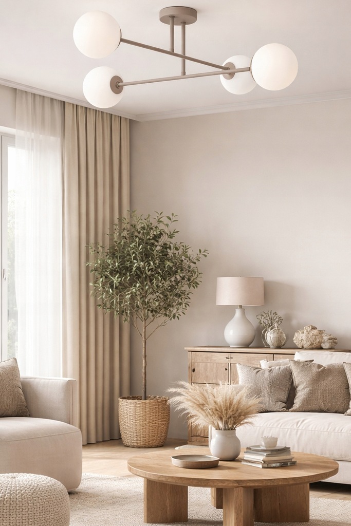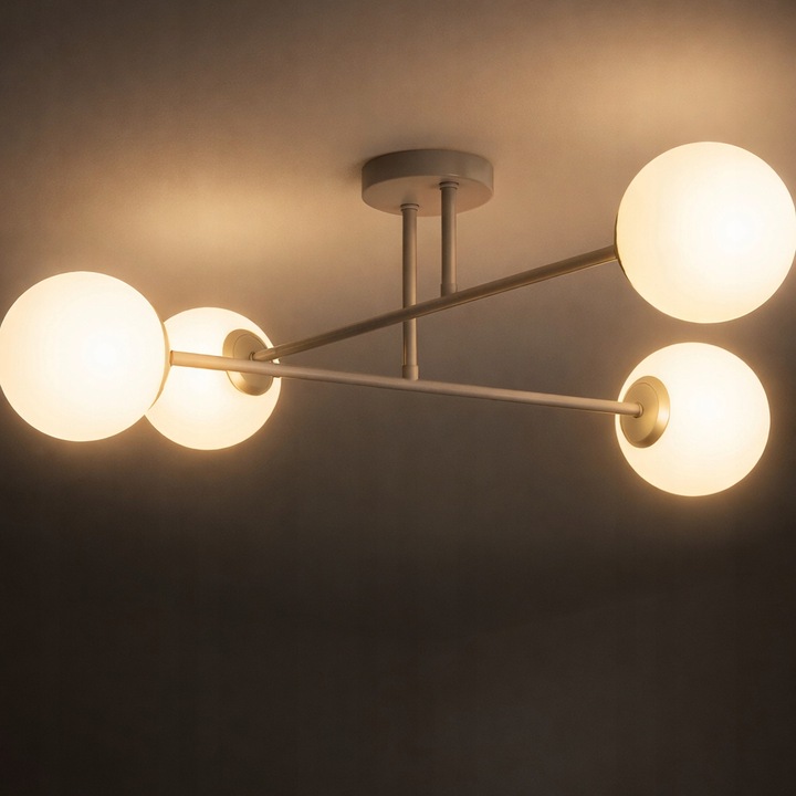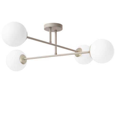 Jej kaszmirowe, beżowe wykończenie oraz kuliste, mlecznobiałe klosze tworzą niepowtarzalny efekt – idealny zarówno do wnętrz klasy premium, jak i nowoczesnych mieszkań.