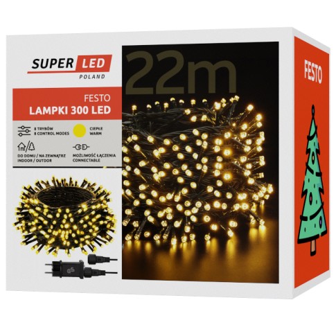 Ten zestaw lampek choinkowych zawiera aż 300 energooszczędnych diod LED rozmieszczonych na kablu o długości 22 metry!