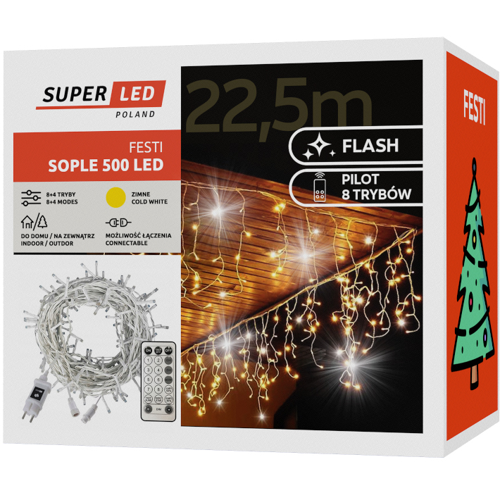 Długość sznura zasilanego prądem, to aż 22,5 metra, w tym 20 metrów części oświetlającej, na którą składa się do 500 energooszczędnych diod PREMIUM w kolorze zimnym. Całość w ciemności prezentuje się niesamowicie nastrojowo, co pobudza wrażenie o świątecznym klimacie. Co niezwykle ważne - przepalenie jednej diody nie powoduje zgaśnięcia całego łańcucha.