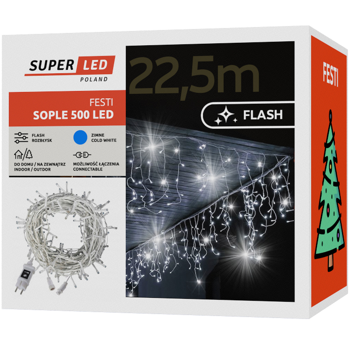 Poczuj magiczny klimat, z lampkami Premium Kurtyna świetlna w formie sopli marki SuperLED to spektakularne oświetlenie, które udekoruje blaskiem przestrzeń wokół Twojego domu. Lampki swym światłem dadzą nieodparte wrażenie, że na ozdobionym domu znajdują się prawdziwe, iskrzące lodowe zwisy, magicznie mieniące się w mroku. Długość sznura zasilanego prądem, to aż 22,5 metra, w tym 20 metrów części oświetlającej, na którą składa się do 500 energooszczędnych diod PREMIUM w kolorze zimnym. Całość w ciemności prezentuje się niesamowicie nastrojowo, co pobudza wrażenie o świątecznym klimacie. Co niezwykle ważne - przepalenie jednej diody nie powoduje zgaśnięcia całego łańcucha. Postaw na sprawdzone, energooszczędne sople marki SuperLED.
